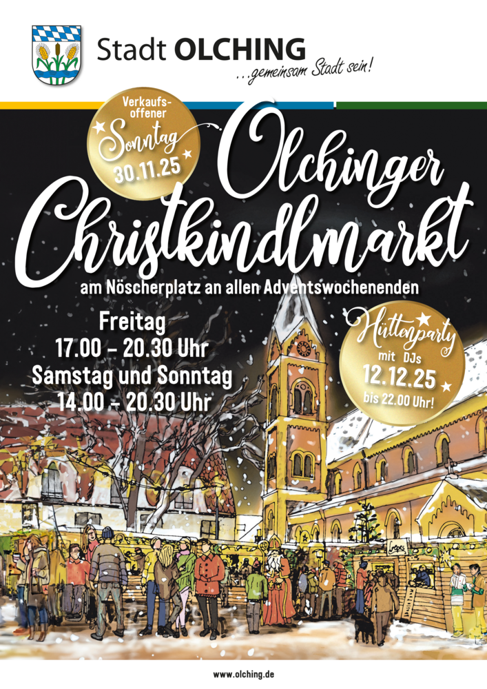 Der Olchinger Christkindlmarkt findet an allen vier Adventswochenenden immer von Freitag bis Sonntag statt. Auf die Besucher wartet ein abwechslungsreiches Rahmenprogramm mit Kunsthandwerkern und verschiedensten Musikgruppen. In den verschiedenen Holzhütten bieten Händler Ihnen Kunsthandwerk, Getränke und Speisen sowie hausgemachte Weihnachtsleckereien an.