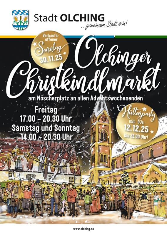 Auch in diesem Jahr lädt der Olchinger Christkindlmarkt an allen vier Adventswochenenden zum gemütlichen Beisammensein ein. Die Öffnungszeiten bleiben wie gewohnt: freitags von 17:00 bis 20:30 Uhr sowie samstags und sonntags von 14:00 bis 20:30 Uhr.
