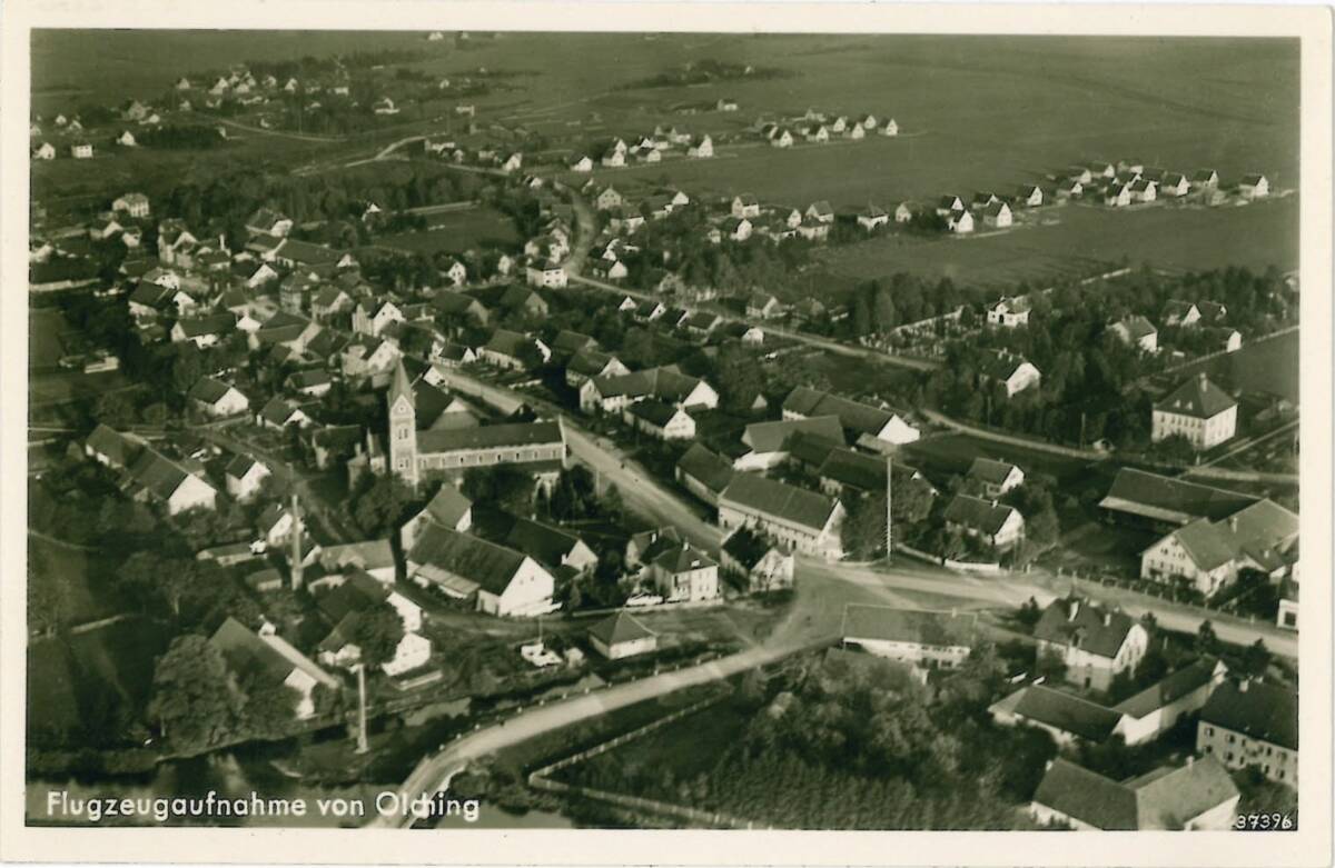 Die Luftbildaufnahme von ca. 1940 zeigt den Turm in der linken unteren Bildhälfte am Zusammenfluss von Amperkanal und Schramlbach.